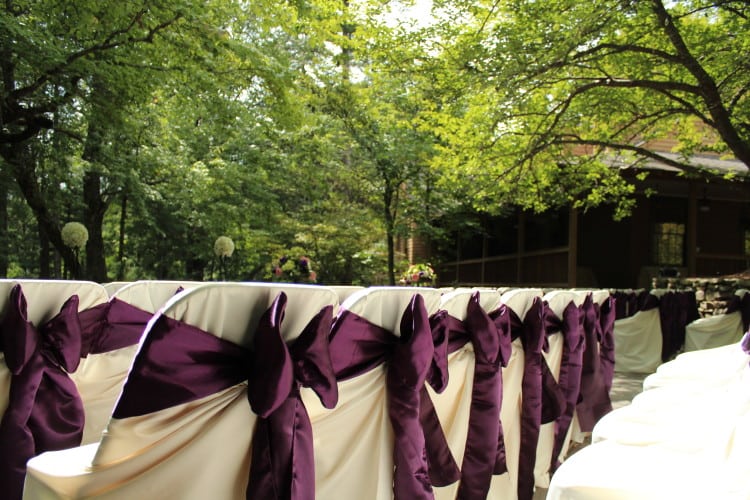 We carried the beautiful plum satin outside for her ceremony chairs along with ivory chair covers.