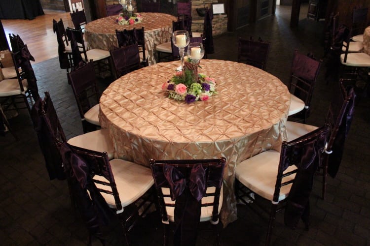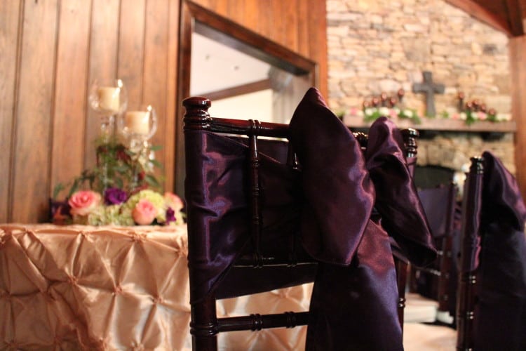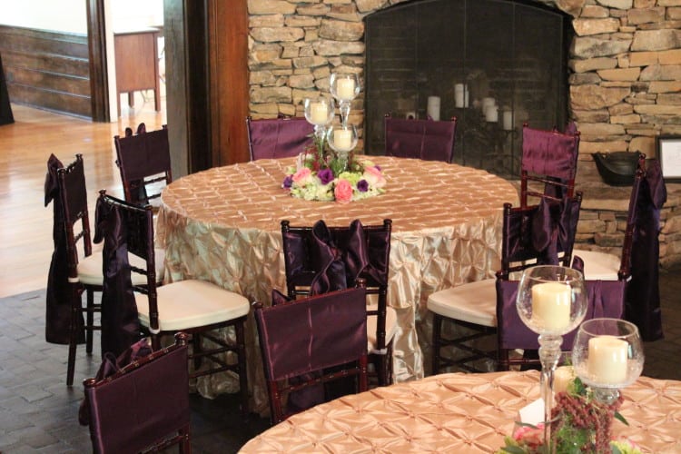 As a former Chimney’s bride myself, I was more than pleased to help Nikki when she contacted Décor to Adore at Peggy Echols urging. Nikki was interested in using texture in her linens, bringing in shades of gold and deep purple, for an elegant reception.
