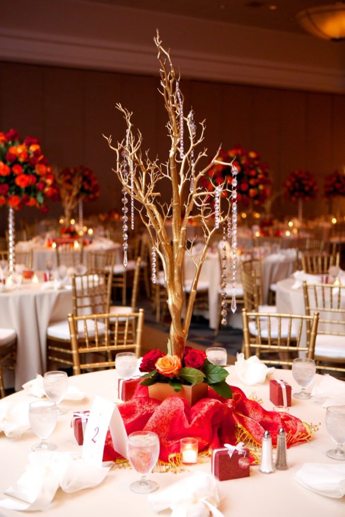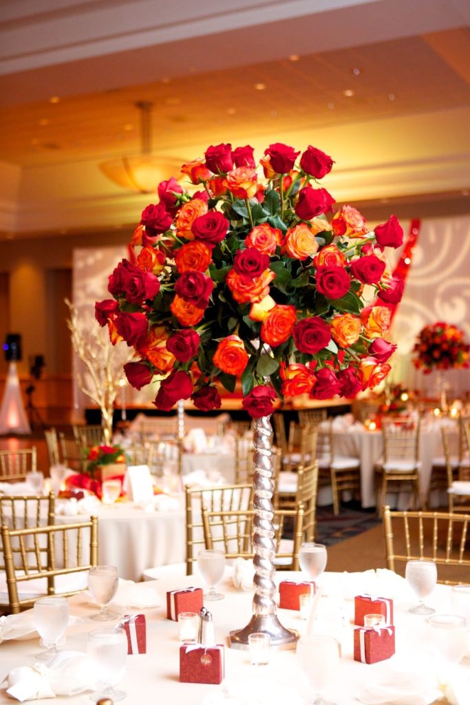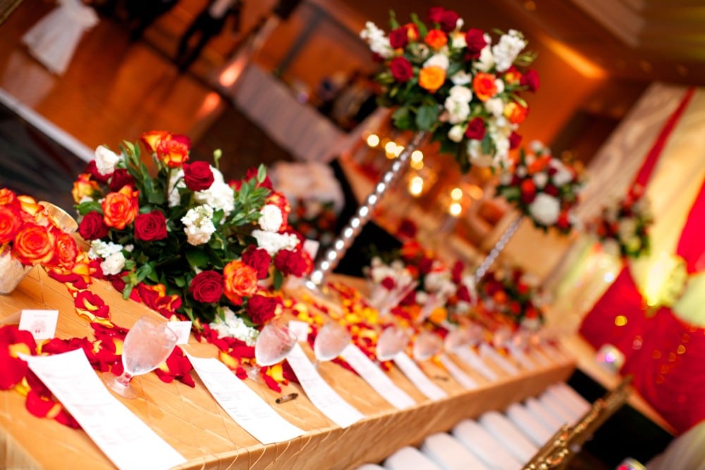 Sonia decided to work with shades of champagne and gold to compliment the reds and yellows in her floral arrangements. Arden photography captured a wonderful angle of the head table, featuring our gold Pintuck linens.